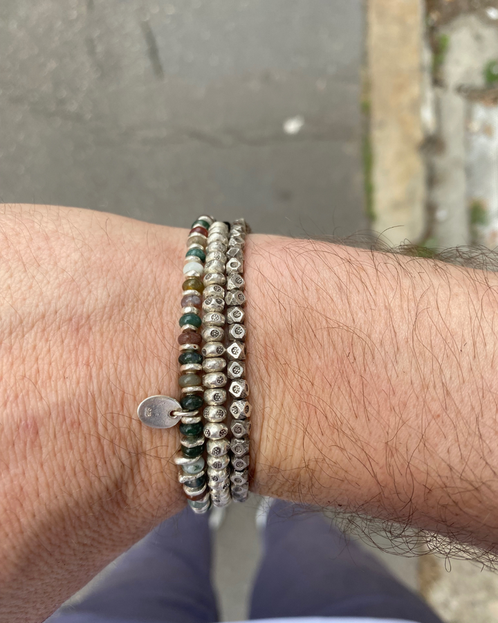 Un héritage gravé dans l’argent. Ce bracelet unit l’élégance intemporelle de l’argent 925 aux motifs floraux traditionnels Karen, gravés à la main selon un savoir-faire millénaire. Chaque perle porte la trace d’un artisanat vivant, empreint de symboles et de sagesse.