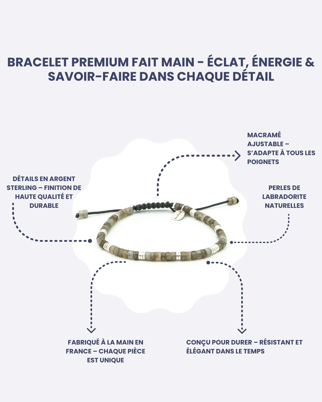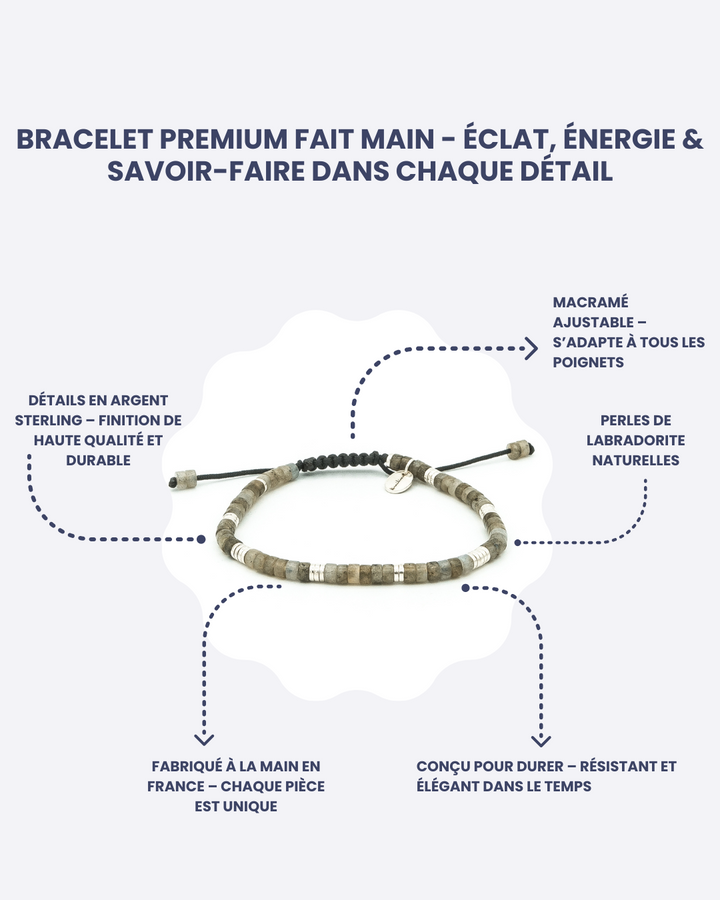 Succombez à l'élégance changeante de ce bracelet. Labradorite aux reflets bleutés : une beauté subtile qui évolue à chaque mouvement.